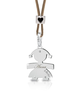 La lastra è lucida e c'è la possibilità di inciderci sopra il nome della tua bambina. Accompagnata da un cordino nero fermato da un distanziatore in oro bianco.