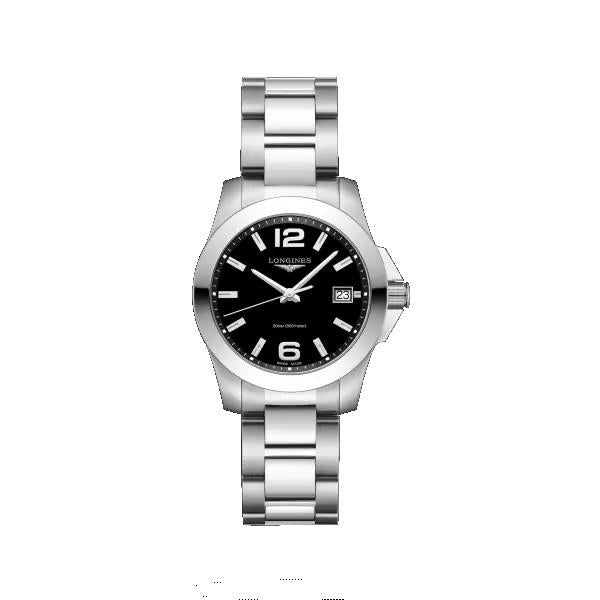 Orologio Longines Conquest, referenza L33774586, cassa in acciaio inossidabile di forma rotonda con un diametro di 34mm e uno spessore di 9mm. Il vetro è in zaffiro antigraffio bombato con trattamento antiriflesso multistrato sul lato interno. Il fondello e la corona sono a vite con una resistenza all'acqua di 30 bar. Il colore del quadrante è nero con numeri arabi e indici dipinti. Le lancette sono argentate lucide. Il movimento è al quarzo calibro L156 con funzione di ore, minuti, secondi e data.
