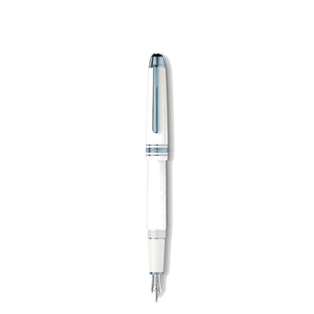 Penna stilografica Meisterstück Glacier Classique, caratterizzata da una pregiata resina bianca. Lo strumento da scrittura è impreziosito da dettagli in metallo finitura PVD blu e completato da un pennino in oro massiccio Au585 / 14K con finitura rodio, decorato da una riproduzione del ghiacciaio Mer de Glace, simile a un drago, che domina la cima del Monte Bianco.