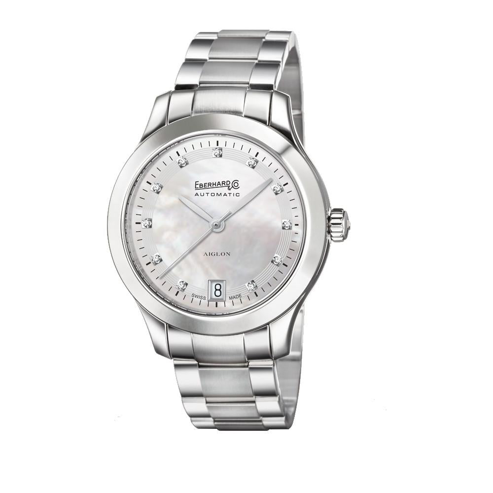 Orologio Eberhard Aiglon Dame, cassa in acciaio inossidabile con un diametro di 35 mm, quadrante in madreperla con diamanti sugli indici, vetro in zaffiro antigraffio. Il meccanismo è automatico Swiss Made con funzione di orario e datario. Il bracciale è in acciaio inossidabile. La resistenza all'acqua è 5 bar.