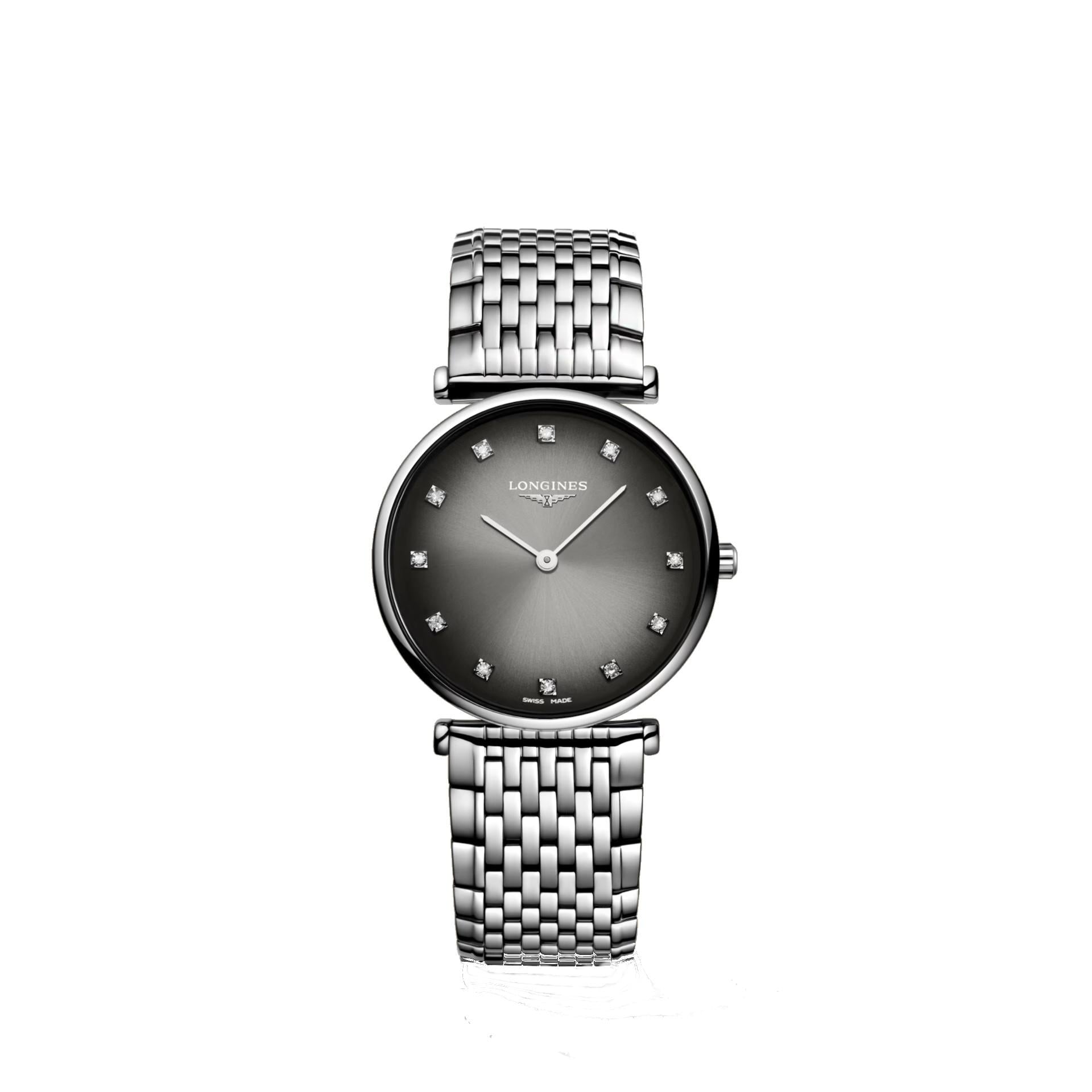 Orologio Longines la grande classique, cassa in acciaio inossidabile con un diametro di 29mm e uno spessore di 4,5mm. Il quadrante è di colore grigio con 12 diamanti incastonati. Meccanismo al quarzo con funzione di solo tempo. Bracciale in acciaio inossidabile.