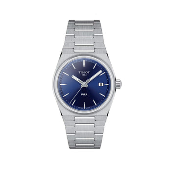 Orologio Tissot PRX, cassa in acciaio inossidabile con un diametro di 35 mm, quadrante di colore blu, vetro in zaffiro antigraffio. Meccanismo al quarzo Swiss Made con funzione di orario e datario. Bracciale in acciaio inossidabile. Resistenza all'acqua di 10 bar.
