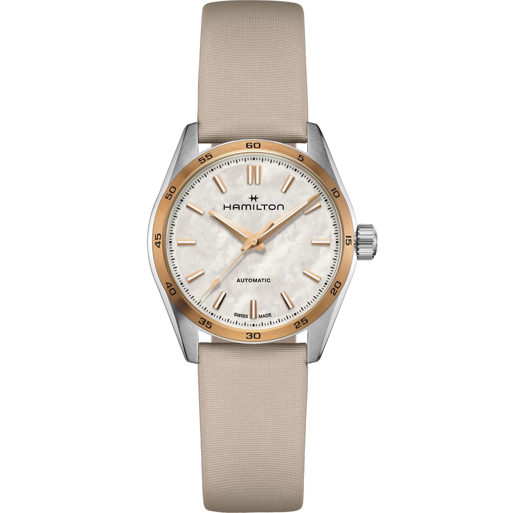 Orologio Hamilton Jazzmaster, cassa in acciaio inossidabile con un diametro di 34mm, quadrante in madreperla, vetro in zaffiro antigraffio. La resistenza all'acqua è 10 bar. Il meccanismo è automatico calibro H-10 con funzione di solo tempo e una riserva di carica fino ad 80 ore.