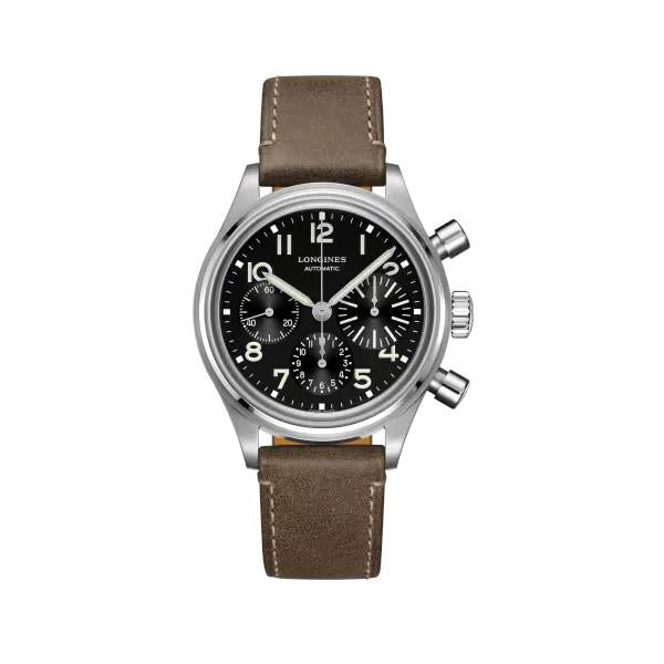 Orologio Longines Avigation BigEye, referenza L28164532, cassa in acciaio inossidabile con un diametro di 41mm e uno spessore di 14,50mm. Il vetro è in zaffiro antigraffio bombato con trattamento antiriflesso multistrato sul lato interno. La resistenza all'acqua è di 3 bar. Il quadrante è di colore nero con numeri arabi dipinti e lancette argentate satinate. Il movimento è automatico calibro L688 con frequenza di 28'800 alternanze orarie e riserva di carica di circa 66 ore, le funzioni cronografiche sono lancetta centrale dei 60 secondi, contatore dei 30 minuti a ore 3 e contatore delle 12 ore a ore 6.