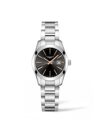 Orologio Longines Conquest Classic Donna, referenza L22864526, cassa di forma rotonda in acciaio inossidabile con un diametro di 29,50mm e uno spessore di 8,70mm. Il vetro è in zaffiro antigraffio bombato con trattamento antiriflesso multistrato sul lato interno. La resistenza all'acqua è di 5 bar. Il quadrante è nero con indici applicati e lancette di colore rosa. Il movimento è al quarzo Swiss Made calibro L152 con funzione di ore, minuti, secondi e data.