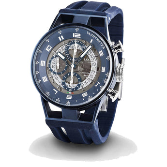 Orologio Locman Della collezione Montecristo, referenza 0516B22S-BLTKBLSB, cassa in acciaio e titanio della dimensione di 44mm con trattamento in PVD blu, quadrante scheletrico con numeri arabi stampati. Cinturino in silicone blu. Impermeabilità di 10 atm. Meccanismo automatico con funzioni di ora data e cronografo.