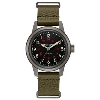 Orologio Bulova da uomo, cassa in acciaio inossidabile con un diametro di 38 mm e uno spessore di 13 mm. Il quadrante è di colore nero con numeri arabi. Il meccanismo è automatico con funzione di solo tempo e una riserva di carica di 42 ore. Il cinturino è in pelle di colore verde. Il vetro è minerale. Water Resistant.