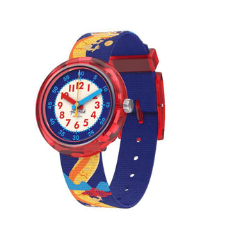 Orologio Flik Flak Year of the Dragon con movimento al quarzo e impermeabilità fino a 3 Bar. Il cinturino è realizzato in PET riciclato, mentre la fibbia è in plastica biologica. La cassa è anch'essa in plastica biologica e il design è della collezione FLIK FLAK YEAR OF THE DRAGON. Presentato in una confezione speciale, con quadrante e cinturino blu e cassa rossa, dal design rotondo.