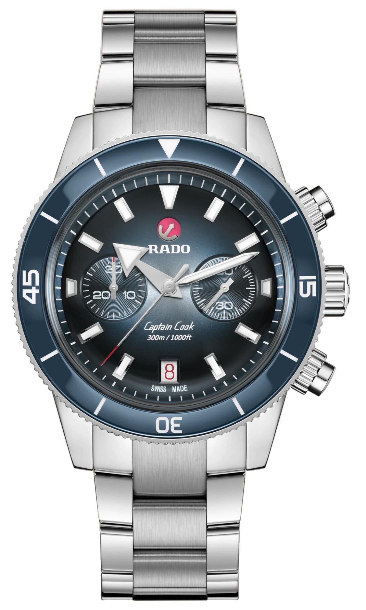 Orologio Rado da uomo Captain Cook, cassa in acciaio inossidabile con un diametro di 43mm e uno spessore di 14,8mm. Il vetro è in zaffiro con rivestimento antiriflesso. La resistenza all'acqua è di 30 bar. Movimento automatico Swiss Made con funzione di orario e datario. La riserva di carica è di 59 ore. Ghiera girevole in ceramica Hi-tech. Bracciale in acciaio inossidabile.