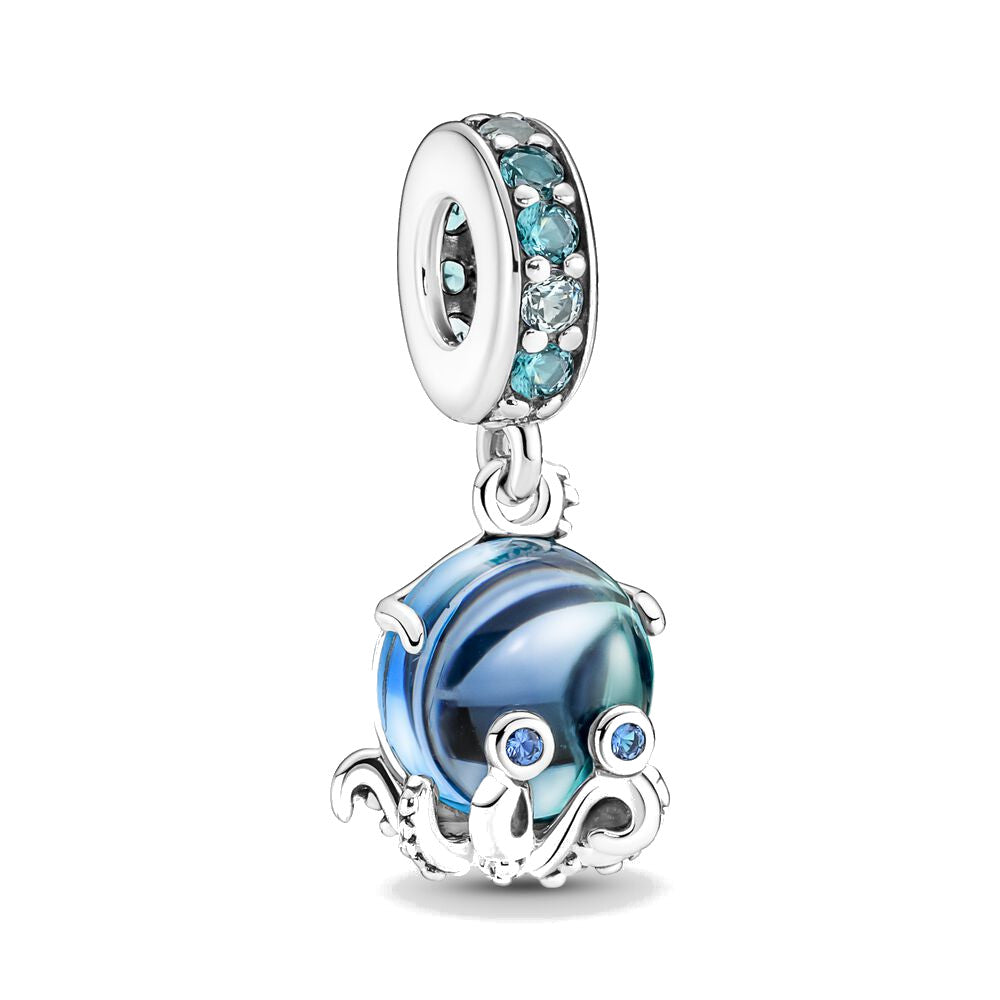 Il charm pendente è realizzato in vetro di Murano verde e blu bicolore con un motivo openwork a onde sul retro in argento sterling 925. I tentacoli in argento sterling 925 sono arricciati e mettono in risalto la natura giocosa di questa creatura oceanica amichevole e misteriosa. I cristalli creati dall'uomo in tre tonalità di blu aggiungono ulteriore brillantezza al gancio e agli occhi del polpo.