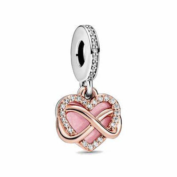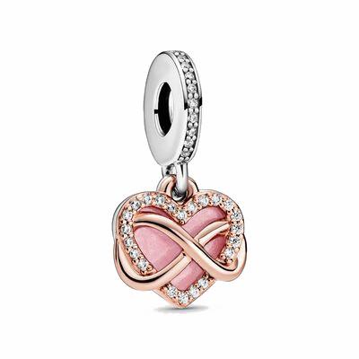 Il charm anteriore è rifinito a mano e realizzato in Pandora Rose, l' esclusiva lega metallica con placcatura in Oro Rosa 14K e presenta il simbolo dell’infinito avvolto intorno a un cuore scintillante con pietre di zirconia cubica circondate da placcatura di rodio bianco. Lo smalto rosa applicato a mano sul pendente posteriore fa da sfondo al messaggio pieno d’amore del pendente con l’incisione “Family Forever and always”.