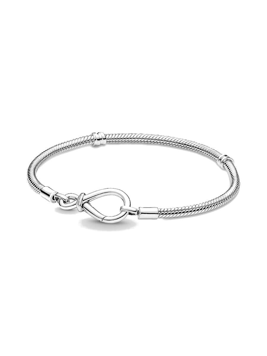 Bracciale Pandora Moments con maglia snake e nodo dell'infinito presenta un nodo dell'infinito asimmetrico che funge da chiusura. Due divisori in rilievo dividono il bracciale in tre sezioni. Questo simbolo di amore eterno può essere indossato da solo o può essere personalizzato con un charm o charm pendente sulla chiusura e con 14–16 charm, charm pendenti o pendenti sul resto del bracciale.