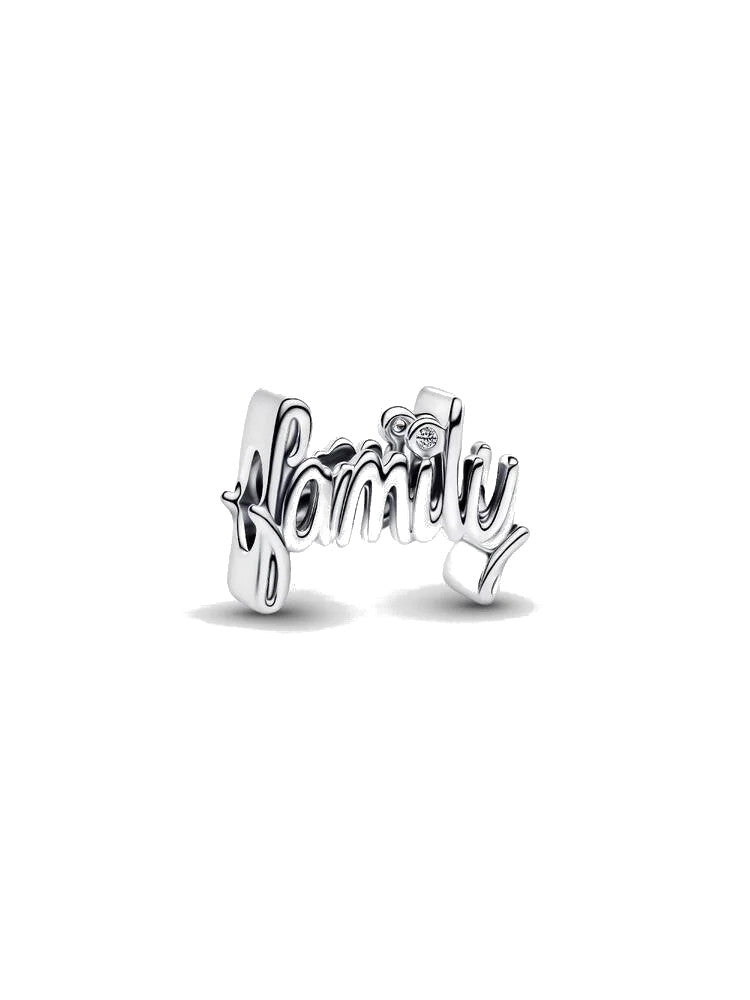 Un promemoria splendente di ciò che conta davvero. Questo charm in Argento Sterling 925 presenta la delicata scritta a mano "family", impreziosita da una zirconia cubica posizionata sopra la lettera "i", simbolo di luce, amore e connessione.