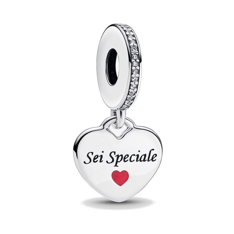 Charm pendente in argento sterling 925 con l'incisione "Sei Speciale" e un cuore in smalto rosso. Il pendente presenta una fila di zirconia scintillante.