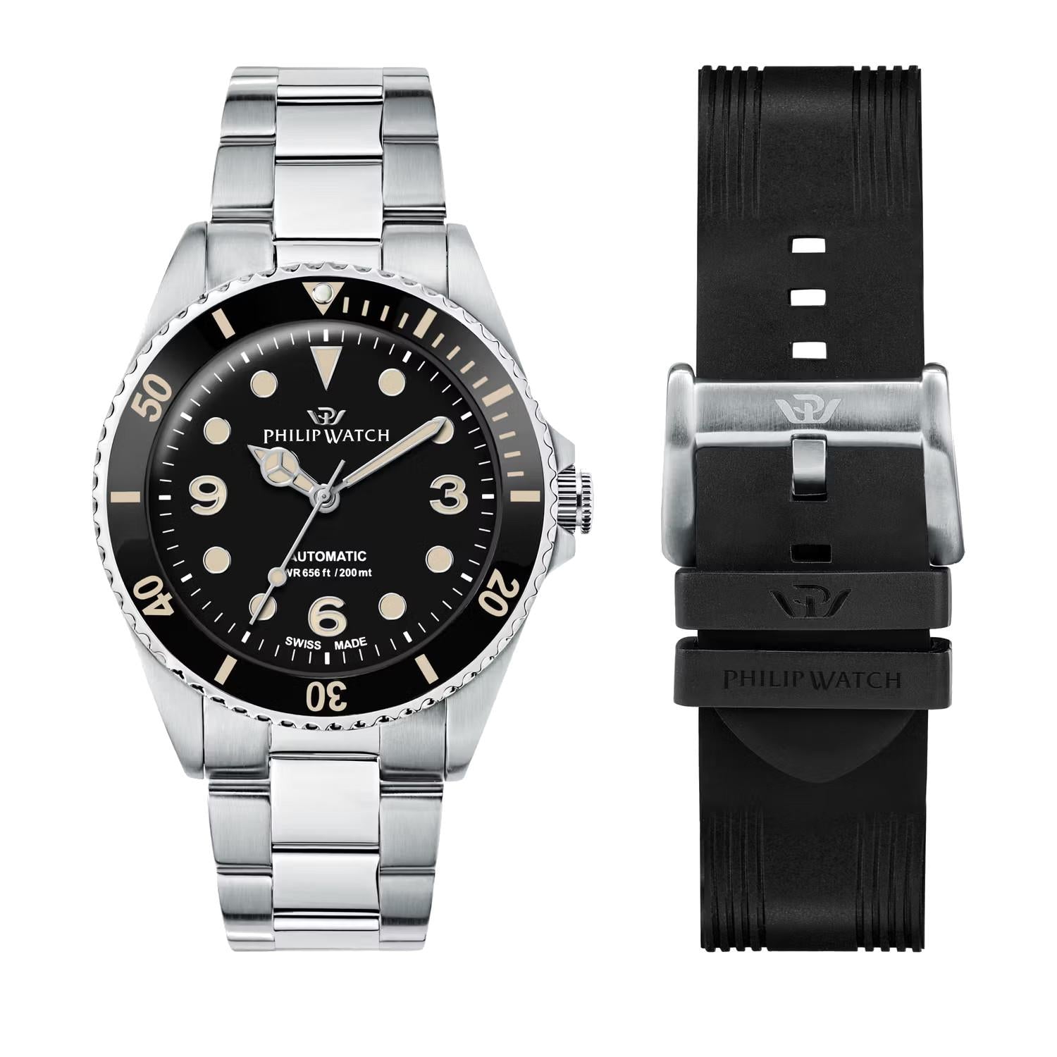 Orologio Philip Watch Caribe Diving - Design elegante con cassa in acciaio e cinturino in silicone resistente. Grazie al vetro zaffiro e alla chiusura con blocco di sicurezza, è l'ideale per lo sport. Swiss made con resistenza all'acqua fino a 20atm. Per un'esperienza di immersione sicura e affidabile.