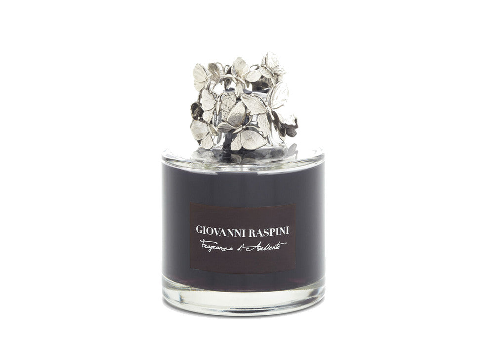 Un profumatore d'ambiente elegante e ricercato, in cui lo stile inconfondibile di Giovanni Raspini si unisce alla preziosità della fragranza Nero Divino. Il decoro Farfalle, realizzato in bronzobianco — una speciale lega di bronzo sviluppata dall'azienda per la linea casa, caratterizzata da sfumature argentate e caldi riflessi — dona al diffusore un fascino delicato e luminoso.