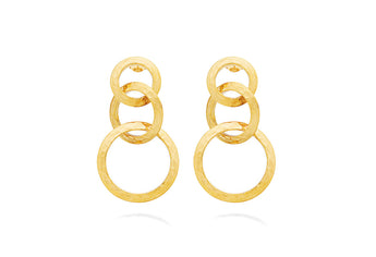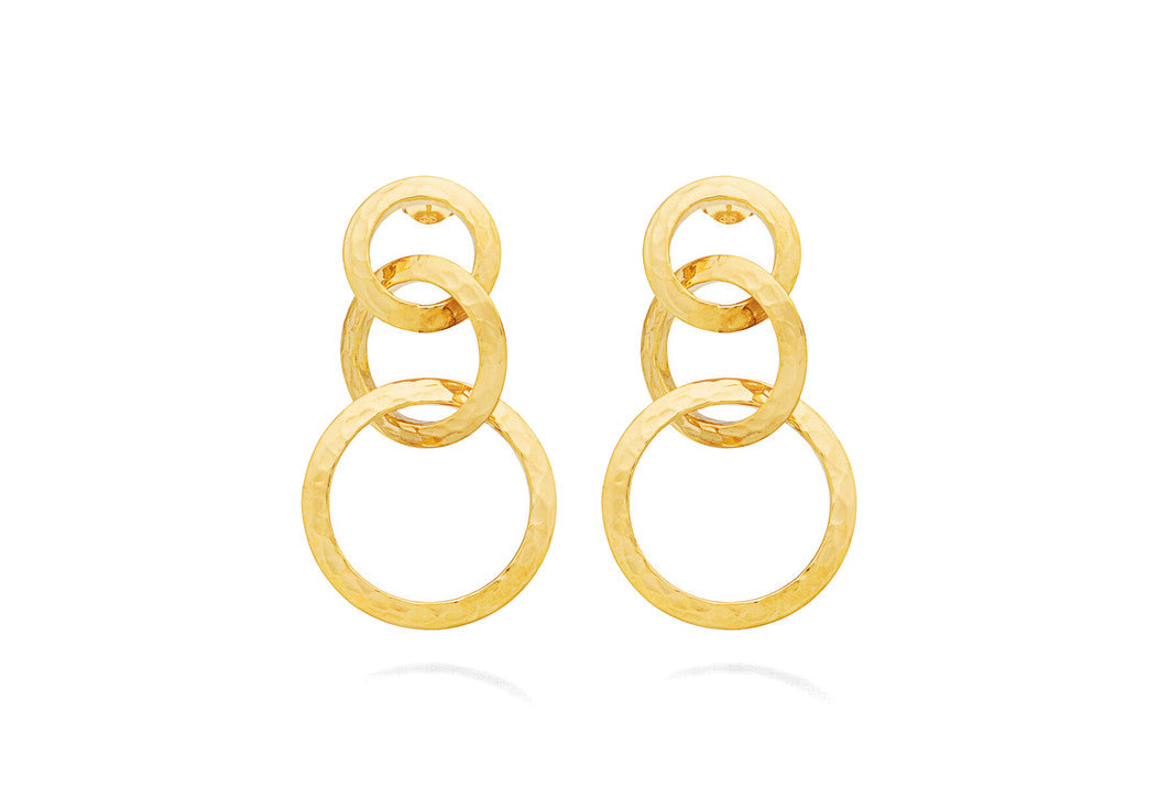 Lasciati conquistare dalla luce vibrante di questi splendidi orecchini a cascata in argento 925 con bagno d'oro 18 kt. Caratterizzati da anelli di tre dimensioni e una raffinata texture materica, realizzata a mano tramite martellatura della lastra d'argento, questi gioielli esprimono tutta la passione di Giovanni Raspini per il design contemporaneo e l'innovazione.