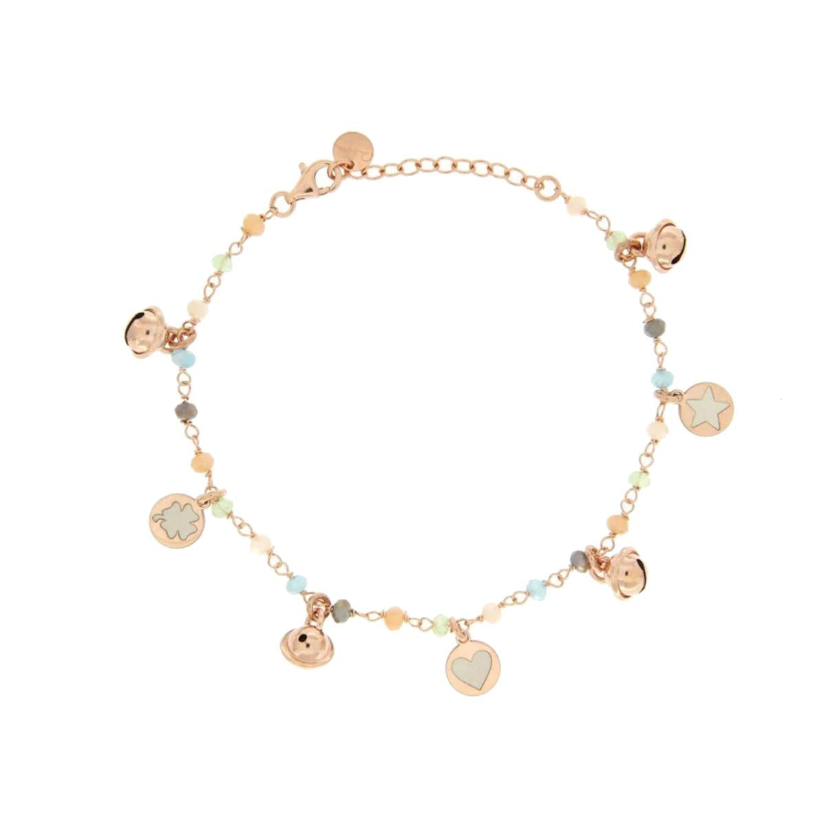 Bracciale Rue des Mille della linea gipsy chic, realizzato in argento 925 con placcatura in oro rosa e pietre. Il bracciale è composto da 4 ciondoli a campanellino e 3 medagliette con rappresentato un quarifoglio, un cuore e una stella. Lungo la catena ci sono rilegate delle pietre di colore azzurro, rosa, verde e bianco. La lunghezza è 17cm + 3cm di regolazione.