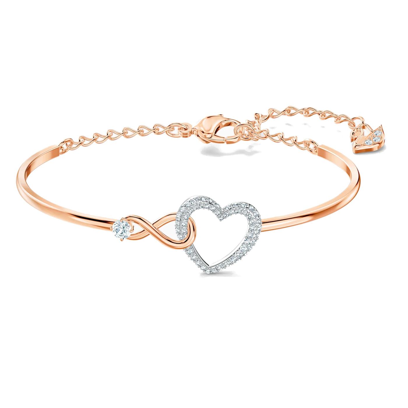 Un simbolo di amore infinito: Questo elegante bangle Swarovski mette in risalto i simboli di amore ed eternità intrecciati tra loro. Decorato con cristalli Swarovski bianchi, il motivo a forma di cuore completa alla perfezione il simbolo dell’infinito, per un look davvero romantico. Un mix di placcature del metallo bilancia alla perfezione tonalità calde e fredde, per completare il design. È una meravigliosa idea regalo (e una promessa) per una persona speciale.
