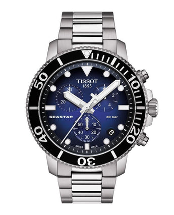 Orologio Tissot Seastar 1000 Orologio Cronografo impermeabile 300 Mt (1000ft.), Cassa in Acciaio e Bracciale in Acciaio, Quadrante di colore Blu Sfumato, Datario e Vetro Zaffiro.