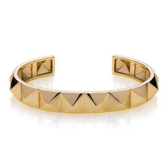 Il nostro bracciale in bronzo con finitura lucida è un pezzo grintoso, ricco di dettagli. Realizzato con bagno in oro giallo 24 kt, presenta un design a piramidi in rilievo e una vestibilità adatta per un polso che va dai 17 ai 21 cm. Per un look originale, prova a combinare tre colori insieme.