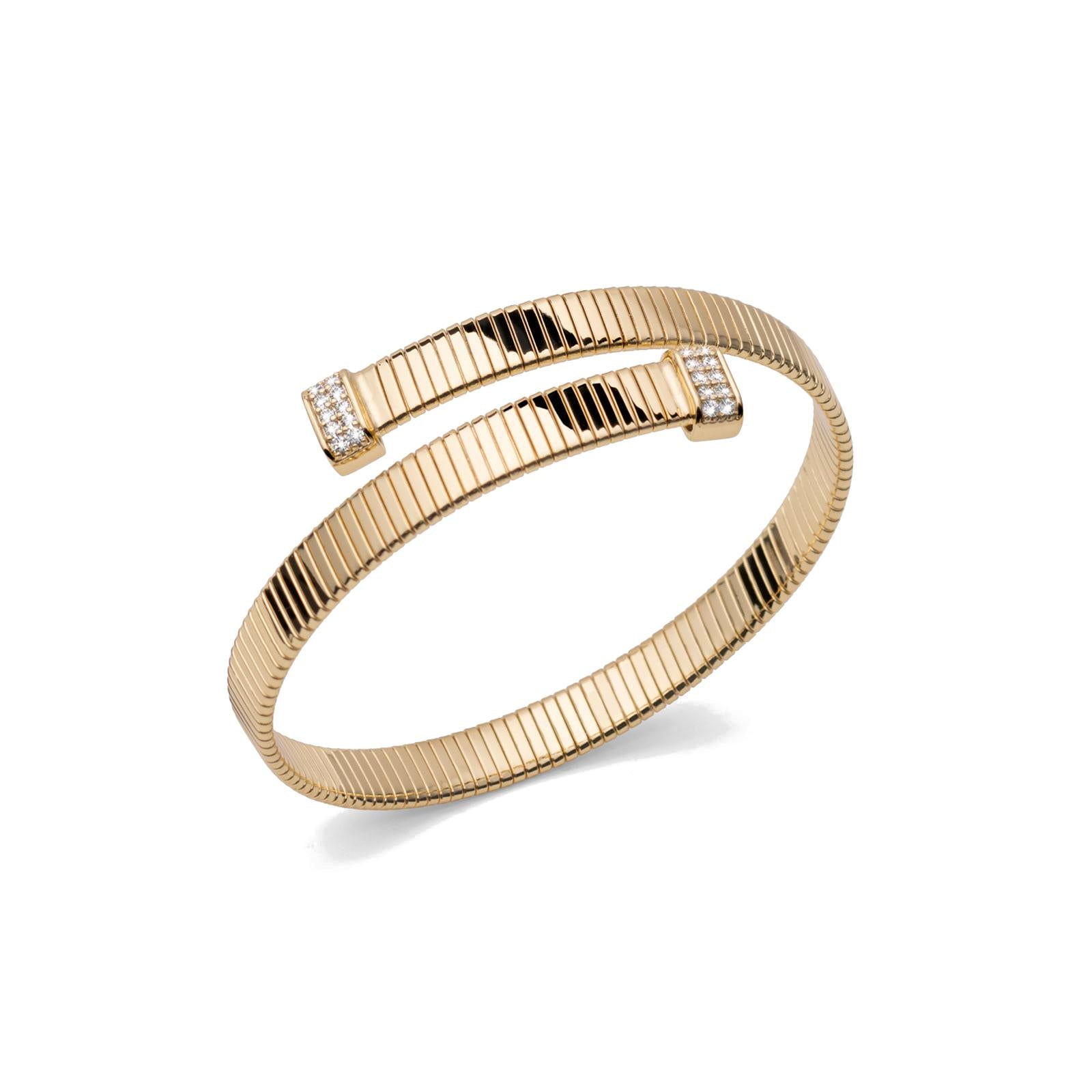 Bracciale rigido contrarié in maglia tubogas piatta con decoro finale di zirconi. Misura 19,00 cm. Un gioiello dal fascino eclettico che unisce uno stile e un design contemporaneo ad una lavorazione tradizionale e sapiente. Sfoggia questo bracciale con outfit eleganti e casual e non perderti l'abbinamento con la collana per rendere unico ogni tuo look.