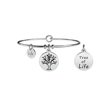 Rami che seguono la forma del vento, chiome che tendono all'infinito. Le sue radici sono l'anima del futuro, al suo interno scorre linfa che genera vita. Il collegamento profondo tra l'uomo e la Madre Terra.Bangle in acciaio con ciondolo Albero della Vita. • Chiusura tonda • Misura unica, diametro 6 cm • Materiale: Acciaio 316L, Cristallo • Designed by Kidult in Italy