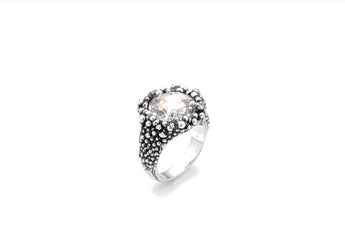 Un gioiello che unisce artigianalità scultorea e luminosità assoluta. Questo anello in argento 925, realizzato con la tecnica della fusione a cera persa, avvolge con forme morbide e materiche un grande zircone trasparente, capace di riflettere la luce più pura.