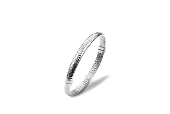 Eleganza senza tempo e artigianalità si fondono in questo bangle in Argento 925, dal design essenziale ma di grande impatto. La superficie martellata a mano dona una luminosità unica e irregolare, riflettendo la luce in ogni movimento e conferendo al gioiello un carattere autentico e sofisticato.