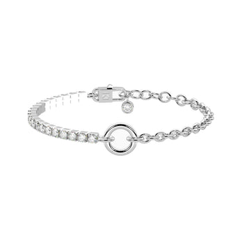 Un gioiello versatile e brillante pensato per valorizzare ogni look. Il bracciale Duetto unisce due stili in un unico design: metà catena tennis illuminata da zirconi bianchi da 4 mm e metà catena rolò in acciaio, per un effetto moderno ed elegante.