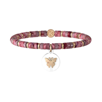 Bracciale elastico con cilindri in diaspro rosso alternati ad anelli in acciaio color oro rosa e ciondolo satinato tondo con farfalla in rilievo color oro rosa.