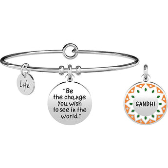Bracciale da donna Kidult della collezione Gandhi, realizzato in acciaio inossidabile con pendente a medaglia e smalto. La frase incisa sulla medaglia è (Be The Change You Wish To See In The World).