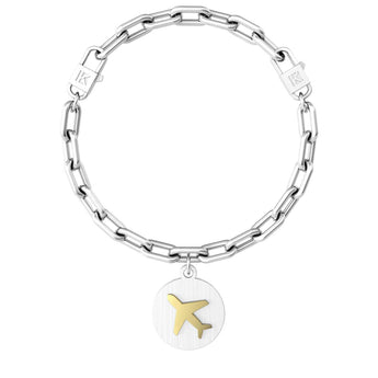 Bracciale maglia ovale in acciaio 316L con ciondolo tondo satinato, aereoplano in pvd giallo lucido e retro in pvd gun metal, lunghezza cm 19. Scritta: DREAM DISCOVER TRAVEL Dimensioni: catena 9.5x5 mm tondo Ø 17 mm