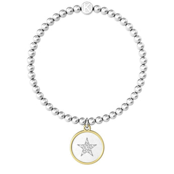 Bracciale elastico in acciaio 316L con sfere e ciondolo tondo lucido, bordo in pvd giallo lucido e stella con cristalli, lunghezza cm 17. Scritta: FIGLIA, SEI LA NOSTRA STELLA... Dimensioni: sfera Ø 4 mm tondo Ø 18 mm cristalli bianchi Ø 1.25 mm