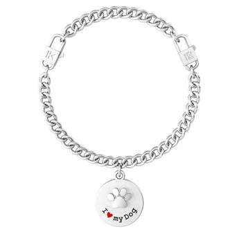 Bracciale groumette in acciaio 316L con ciondolo tondo lucido, smalto rosso e cristallo, lunghezza cm 19. Scritta: I ?? my dog Dimensioni: catena 5.8x4.3 mm tondo Ø 17 mm cristallo bianco: Ø 2 mm