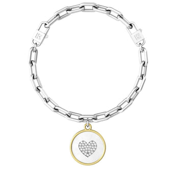 Bracciale maglia ovale in acciaio 316L con ciondolo tondo lucido, bordo in pvd giallo lucido e cuore con cristalli, lunghezza cm 19. Scritta: SEI LA MAMMA MIGLIORE DEL MONDO catena 9.5x5 mm Tondo Ø 18 mm Cristalli bianchi Ø 1.25 mm
