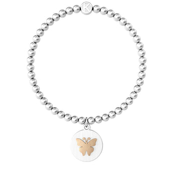 Bracciale elastico in acciaio 316L con sfere e ciondolo tondo satinato, farfalla in pvd rosa lucido, lunghezza cm 17. Scritta: TAKE THE CHANCE Dimensioni: sfera Ø 4 mm tondo Ø 17 mm