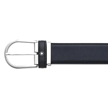 Cintura Montblanc in pelle di vitello di colore blu, con fibbia ad ardiglione in acciaio lucido e satinato a forma di ferro di cavallo. Misura in altezza 3,5cm x 120 cm di lunghezza (regolabile).
