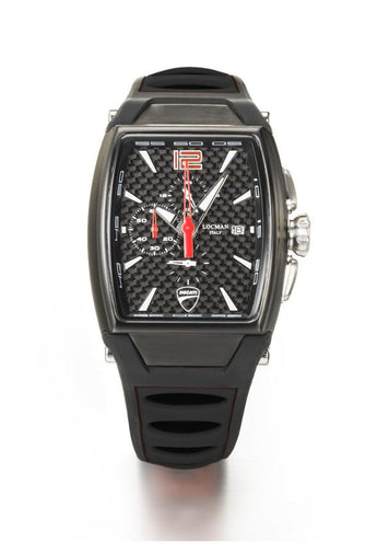 La cassa a forma tonneau, proposta acciaio satinato con rivestimento in pvd nero, è impermeabile fino a 100 metri e racchiude un meccanismo cronografo al quarzo. Il quadrante in fibra di carbonio, riporta sia il logo Ducati a ore 6, che il logo Locman a ore 3. Il cinturino, in silicone anallergico traforato, è fissato alla struttura in acciaio tramite due anse a vite.