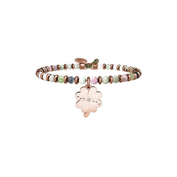 Il prato nasconde un verde talismano, se la fortuna ti vede ti prende per mano. Ricchezza, amore e amicizia sincera, con quattro foglie il tuo sogno si avvera!Bangle con filo armonico in acciaio color oro rosa, sfere in agata multicolor e ciondolo Quadrifoglio. • Incisione e cristallo sul ciondolo • Chiusura con cordino • Misura regolabile, diametro da 5,5 a 6,5 cm • Materiale: Acciaio 316L con Pvd Oro Rosa, Agata, Cristallo • Designed by Kidult in Italy