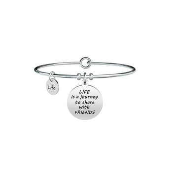 Life is a journey to share with friendsBangle in acciaio con ciondolo satinato tondo. • Incisione smaltata sul ciondolo e cristallo sul retro • Chiusura tonda • Misura unica, diametro 6 cm • Materiale: Acciaio 316L, Cristallo • Designed by Kidult in Italy