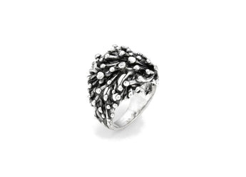 Un gioiello di grande impatto ed eleganza. Questo anello, avvolgente, dai sorprendenti effetti luministici, evoca il fascino delicato della luce lunare. E' così che i toni scuri dell'argento brunito incontrano la brillantezza delle superfici, scolpite a taglio vivo, dando vita ad un gioiello elegante e misterioso. Fatto completamente a mano in azienda.