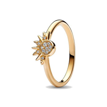 Scopri l'Anello Sole Luminoso Pandora, realizzato con una esclusiva lega metallica placcata in Oro 14K. Sono presenti una pietra zirconia cubica di colore trasparente, temi che ricordano la Natura e i Simboli dell'Universo. La profondità è di 2,2 mm, l'altezza di 10,3 mm e la larghezza di 7,5 mm. Un gioiello unico per un look sofisticato ed elegante.