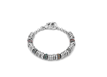 Colori, luce e dettagli preziosi si fondono in questo bracciale Charms in argento 925, dal design giovane e vibrante. Protagonisti sono i sei beads in argento brunito, decorati con la raffinata texture Perlage e impreziositi da micro inserimenti di zirconia cubica multicolore, che donano brillantezza e dinamismo.