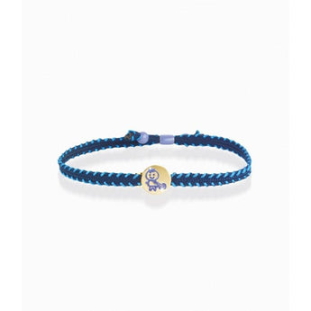Bracciale in oro giallo 9kt con disegnato il segno dell' acquario con smalto blu, il cordino è in canvas. La misura è regolabile in lunghezza.