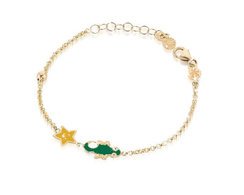 Bracciale per bambini in oro giallo 9kt con disegnato stella e geco in smalto colorato. La lunghezza è regolabile da 13cm a 15cm.
