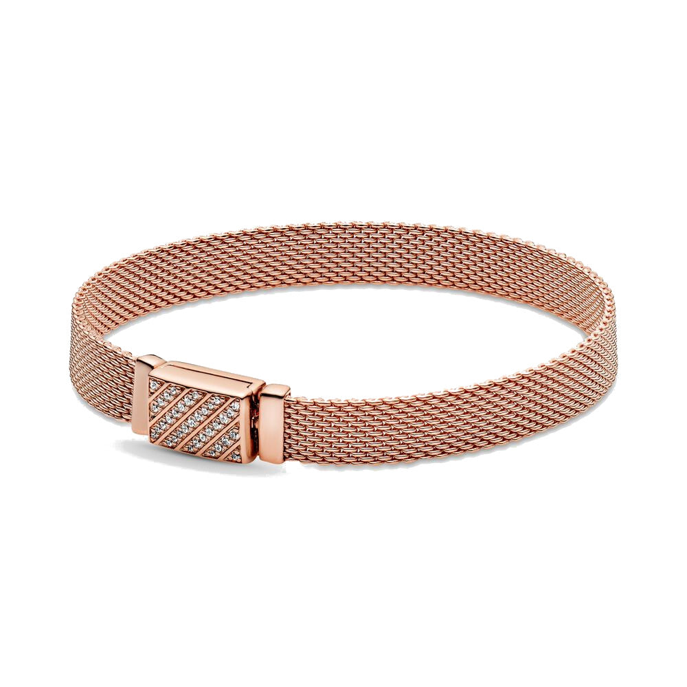 Bracciale Pandora Reflexions con chiusura lunga decorata con pavé. Caratterizzato da una chiusura di forma allungata con file diagonali di pavé di zirconia cubica incolori nella parte anteriore e un retro lucido ornato dal logo Pandora, il raffinato bracciale con maglia mesh piatta è rifinito a mano e realizzato in Pandora Rose (l'esclusiva lega metallica con placcatura in Oro rosa 14K).