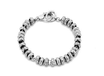 Bracciale Raspini realizzato in argento 925, la lunghezza è 20 Cm. La catena del bracciale è la maglia rolò con ciondoli ciambelline martellate. La chiusura è a moschettone.