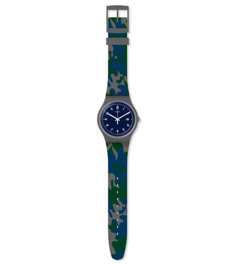 Sul cinturino di CAMOUGREEN (SUOM400) toni terra scuri e stampa camouflage si coniugano con il blu acqua profonda. Cassa, fibbia e passante sono coordinati in grigio scuro.