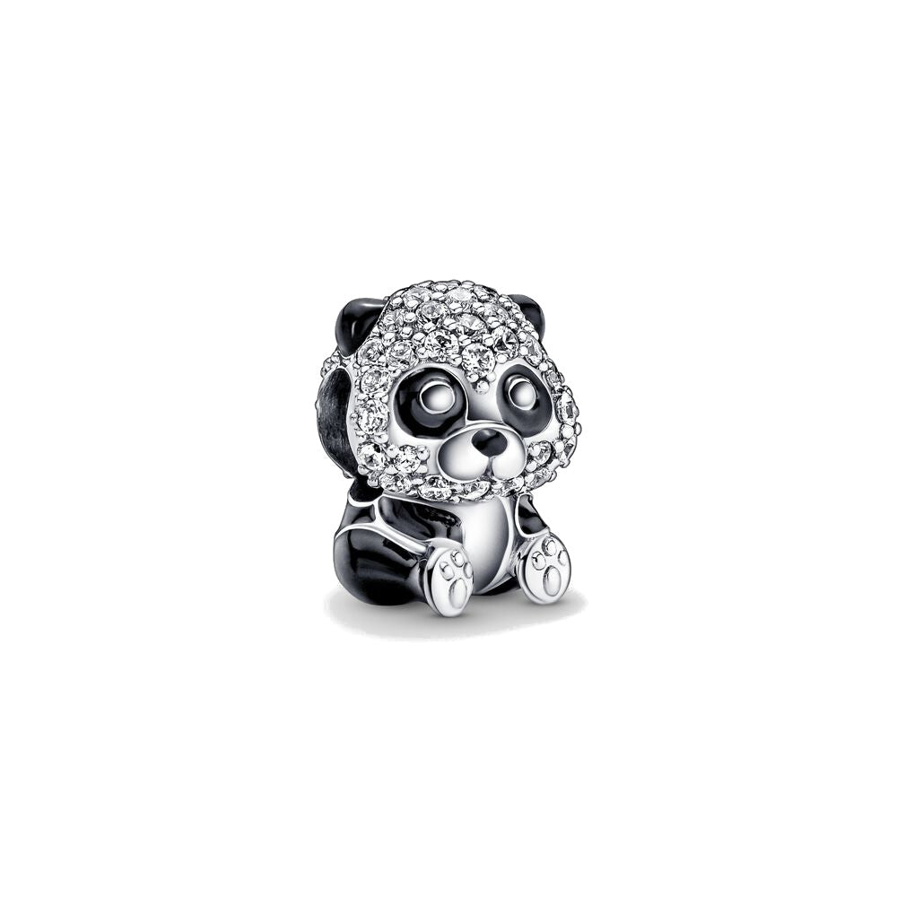 Charm Panda delizioso scintillante. Ispirato all’amato panda gigante, simbolo di forza e saggezza, risplende grazie alle pietre di zirconia cubica incolori con taglio brillante e allo smalto nero lucido. La grossa testa con la postura inclinata aggiunge ancora più personalità a questo tenero amico.